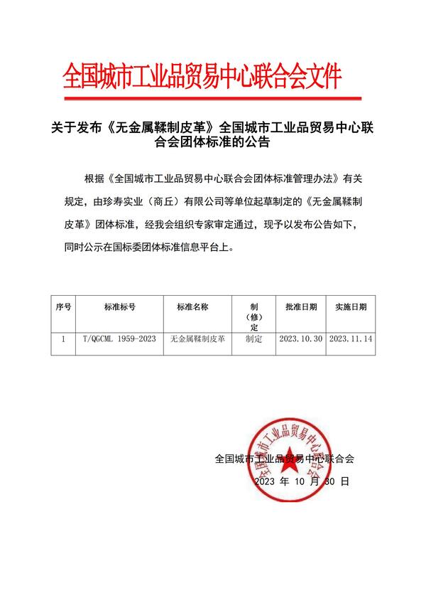 近日,由珍壽實(shí)業(yè)(商丘)有限公司作為起草單位制定的國(guó)家團(tuán)體標(biāo)準(zhǔn)《抗菌功能防水皮革》標(biāo)準(zhǔn)號(hào):T/QGCML 1959—2023;《無(wú)金屬鞣制皮革》標(biāo)準(zhǔn)號(hào):T/QGCML 1960—2023正式在國(guó)家團(tuán)體標(biāo)準(zhǔn)信息平臺(tái)發(fā)布實(shí)施。團(tuán)體標(biāo)準(zhǔn)是我國(guó)標(biāo)準(zhǔn)化工作領(lǐng)域的新生事物,其目的是引領(lǐng)產(chǎn)業(yè)和行業(yè)的發(fā)展。長(zhǎng)久以來(lái),珍壽實(shí)業(yè)(商丘)有限公司高度重視構(gòu)筑標(biāo)準(zhǔn)化能力,提升企業(yè)市場(chǎng)競(jìng)爭(zhēng)力和影響力、降低成本,創(chuàng)造更高的經(jīng)濟(jì)效益。下一步,珍壽實(shí)業(yè)(商丘)有限公司將繼續(xù)把開(kāi)展標(biāo)準(zhǔn)化工作作為長(zhǎng)期的戰(zhàn)略任務(wù),通過(guò)提升標(biāo)準(zhǔn)化水平的方式來(lái)推動(dòng)行業(yè)的高質(zhì)量發(fā)展。
